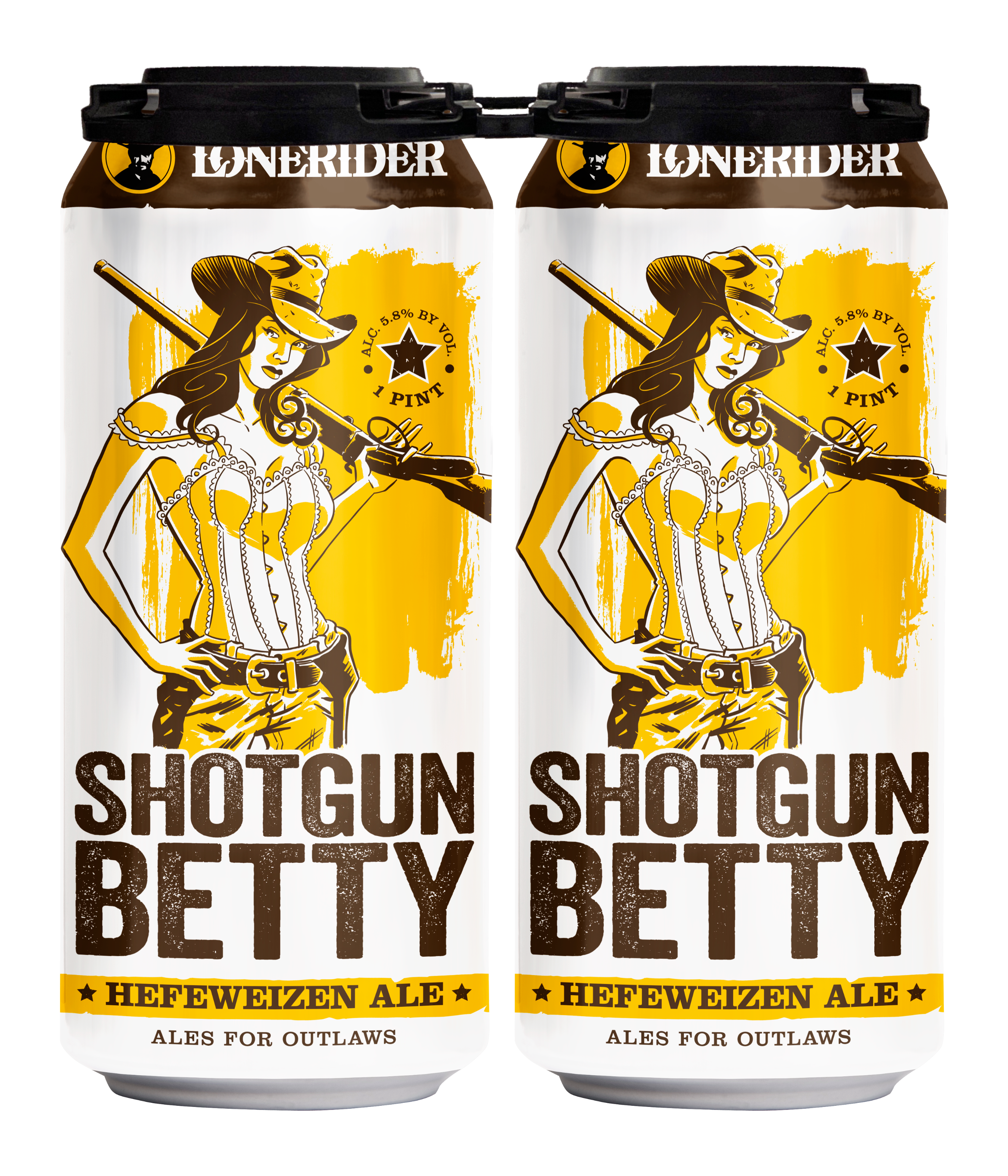 Lonerider’s team of outlaws made a bold choice when choosing their flagship beer. You won’t find a lot of hefeweizens around these parts. In contrast to their Belgian style kin, hefeweizens are made with a special kind of yeast that gives Betty her banana clove flavor. Shotgun Betty gives off a clove, citrus, and yeast aroma with a hint of bubblegum for those refined palates. Betty finishes medium-low in body.